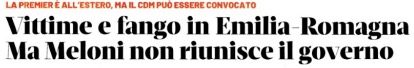 Domenica 21 maggio il giornale dell’ingegnere registra e riferisce, sempre su tutta la prima pagina, e con la puntualità degli orologi che si fabbricano nel Paese dove risiede e paga le tasse il suo editore, la Svizzera, che “Meloni si è accorta dell’alluvione e torna (finalmente) in Italia”. Ma -si affretta a spiegare in quello che tecnicamente si chiama sommario del titolo- “in realtà ha anticipato il rientro di qualche ora”, non di più, saltando la tappa del Kazakistan, evitando di passare per Roma e atterrando direttamente a Forlì, anzi “atterrita”, come da vignetta della Gazzetta del Mezzogiorno.