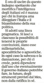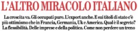 Non parliamo poi del Foglio, dove pure hanno votato e consigliato di votare per il Pd nelle ultime elezioni politiche, nello scorso autunno, e oggi si legge in prima pagina dell’”altro miracolo italiano”, dopo quello storico della ricostruzione post-bellica ai tempi di Alcide De Gasperi e dei suoi successori. Scrive il direttore in persona del quotidiano fondato da Giuliano Ferrara: “La crescita va. Gli occupati pure. L’export anche. E sui titoli di Stato c’è più ottimismo che in Francia, Germania, Uk e America. Qual è il segreto? La flessibilità. Delle imprese e della politica”. E, per chiudere, la raccomandazione di “non perdere un treno” come questo.