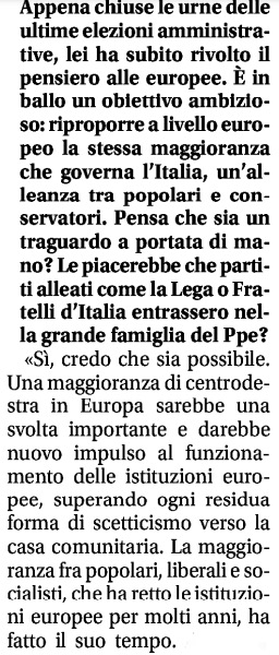 “Sì, credo sia possibile. Una maggioranza di centrodestra -ha detto Berlusconi al direttore del suo ormai ex Giornale di famiglia parlando, immagino, accanto all’onorevole e convivente Marta Fascina, che lui considera e chiama “moglie”- sarebbe una svolta importante e darebbe nuovo impulso al funzionamento delle istituzioni europee, superando ogni residua forma di scetticismo verso la casa comunitaria. La maggioranza fra popolari, liberali e socialisti, che ha retto le istituzioni europee per molti anni, ha fatto il suo tempo”.