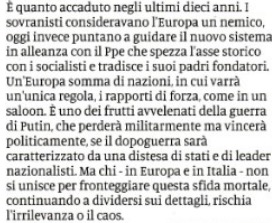 Di tutt’altro avviso è naturalmente Domani, il giornale del vecchio antagonista di Berlusconi nel campo editoriale e non solo, cioè Carlo De Benedetti. Sul cui quotidiano l’ex direttore dell’Espresso Marco Damilano liquida un’Europa di centrodestra come “un saloon” di sovranisti, in cui varranno come “unica regola i rapporti di forza”, anche a causa del clima creato da Putin. Il quale “perderà militarmente” la sua guerra all’Ucraina ma “vincerà politicamente se il dopoguerra sarà caratterizzato da una distesa di Stati e di leader nazionalisti” nel vecchio continente.