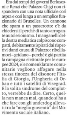 La paura di un centrodestra vincente anche in Europa nelle elezioni dell’anno prossimo per il rinnovo del Parlamento di Strasburgo è avvertita naturalmente anche da chi si è abituato a governare a Bruxelles, a livello sia politico sia burocratico. Ciò spiega l’ultima intemerata di due portavoce della Commissione contro il governo italiano, che ha risposto per le rime con un lungo comunicato di Palazzo Chigi, per presunti ritardi o ridotti controlli nella realizzazione del piano di ripresa e risilienza. E’seguita quella che Repubblica ha definito vistosamente una “tregua armata”. E una protesta della consorella Stampa contro la durezza della reazione della Meloni: “un cannone che spara a un passerotto”, ha scritto il direttore Massimo Giannini lamentando anche “i manganelli della destra mediatica che colpiscono compatti, debitamente ispirati dai rispettivi danti causa di Palazzo”.