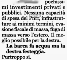 Sarà pur vero, come ha detto l’ex ministro, che la Meloni strizza troppo l’occhio agli evasori e sono “pochissimi gli investimenti privati e pubblici”, che c’è una “fuga di massa verso l’estero”, “nessuna capacità di spesa del Pnrr” e “infrastrutture ai minimi termini”, per quanto Salvini -sempre lui- sia sicuro di costruire finalmente il Ponte sullo stretto di Messina. Sarà pur vero che “purtroppo la barca fa acqua ma la destra festeggia”, come ai tempi -ripeto- dell’ultimo governo Berlusconi. E’anche vero tuttavia che la sinistra è messa peggio della destra ed è perciò la prima garanzia di cui dispone la destra per continuare a governare.
