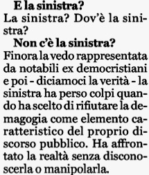 “La sinistra? Dov’è la sinistra?”, ha chiesto chi pure l’ha a lungo rappresentata in Parlamento e nel governo. “Finora -si è risposto da solo Vincenzo Visco- la vedo rappresentata da notabili ex democristiani. E poi, diciamoci la verità, la sinistra ha perso colpi quando ha scelto di rifiutare la demagogia come elemento caratteristico del proprio discorso pubblico” e “ha affrontato la realtà senza disconoscerla o manipolarla”. Meloni comprensibilmente ringrazia.