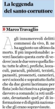 Non contento dei suoi titoli -dopo il “banana” dato ieri all’appena defunto ex presidente del Consiglio, il direttore del giornale ormai più spietato d’Italia ha voluto insultare nel suo editoriale contro “la leggenda del santo corruttore” praticamente tutta la stampa e la televisione, anche quella che ne ospita quasi quotidianamente le opinioni e i lazzi, cioè la 7 di Urbano Cairo, per la presunta accondiscendenza verso un morto immeritevole di rispetto e umana pietà. “Agli innumerevoli delitti commessi da vivo. B. ne ha aggiunto un ultimo da morto”, appunto. “Il più imperdonabile”, ha aggiunto Travaglio spiegando: “averci lasciato questa corte di vedove (non le due vere e quella finta: tutte le altre), prefiche, leccaculi, paraculi, piduisti, terzisti, parassiti, prosseneti, camerieri, servi sciocchi e soprattutto furbi che da due giorni lacrimano per finta (solo lui riusciva a piangere davvero a comando) a reti unificate, devastando quel po’ di informazione e di dignità nazionale che gli erano sopravvissute”.