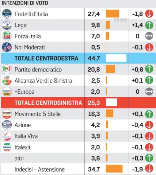 Ma se continuano ad essere buoni per la Meloni, supportata dalla sua intensa attività sul piano internazionale, i numeri cominciano a calare per il suo partito. Che in soli dieci giorni ha perso quasi due punti, scendendo al 29,7 per cento dei voti, di cui quasi uno e mezzo, all’interno della stessa maggioranza, a favore della Lega di Matteo Salvini. Che fa ai “fratelli d’Italia” della premier una concorrenza neppure tanto nascosta nel ricordo dei tempi in cui il centrodestra divenne a trazione appunto leghista. Ciò avvenne, in particolare, nelle elezioni del 2018, quando Salvini investì il suo successo entrando nel governo a trazione, a sua volta, grillina con Giuseppe Conte a Palazzo Chigi.