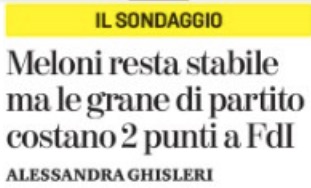 La Ghisleri chiama “grane d partito” quelle che avrebbero penalizzato di quasi due punti in dieci giorni -ripeto- i “fratelli d’Italia”. Che poi sono anche le grane giudiziarie della ministra del Turismo Daniela Santanchè e del sottosegretario alla Giustizia Andrea Delmastro, da cui la premier ha ricavato l’impressione di una certa magistratura all’opposizione. Ma sono, a mio modesto avviso, soprattutto le sopraggiunte grane, sempre giudiziarie, della famiglia di Ignazio La Russa, che ha difeso e assolto dopo un interrogatorio personale il figlio Leonardo Apache, facendogli una lavata di testa solo per avere consumato un presunto stupro a casa sua. Non il massimo, bisogna riconoscerlo, per un presidente del Senato, e un co-fondatore del partito della Meloni.