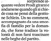 Anche se nata e cresciuta mediaticamente per la volontà mostrata nel 2013, cioè dieci anni fa, di volerne vendicare la mancata elezione al Quirinale, trafitto da almeno 105 franchi tiratori del Pd, la segretaria Elly Schlein non è riuscita a restare a Cesena, invitata dalla minoranza del partito raccoltasi attorno al presidente Stefano Bonaccini, per ascoltare anche il discorso più annunciato e più atteso: quello di Romano Prodi. L’ha apprezzato solo a distanza, non so francamente con quanta convinzione, ispirando forse la vignetta di Emilio Giannelli che oggi sulla prima pagina del Corriere della Sera propone la Schlein timorosa che “la corrente Bonaccini” finisca per investirla come “un tornado”.