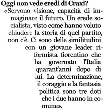 Dopo avere detto, nei tempi d’oro di segretario del Pd, di preferire il ricordo di Enrico Berlinguer a quello di Craxi pensando a un Pantheon della sinistra, Renzi si è deciso solo venerdì scorso, 4 agosto, a rivisitare Craxi, diciamo così, sul suo Riformista facendo celebrare i 40 anni dalla formazione del suo promo governo, il primo guidato in Italia da un socialista, con due interviste elogiative: una al direttore uscente del Giornale, Augusto Minzolini, il restroscenista principe di quel governo, e l’altra a Gennaro Acquaviva. Che a Palazzo Chigi fu con Giuliano Amato il principale collaboratore di Bettino. E stato proprio Acquaviva in questa intervista, lusingandolo con astuzia, a indicare in Renzi l’uomo che politicamente potrebbe essere paragonato di più a Craxi per “determinazione, coraggio e fantasia politica”.
