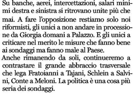 Sono giochi agostani di palazzo -temo- sia quelli di chi ha chiesto l’incontro, sia quelli di chi lo ha accordato, sia quelli di chi si è rifiutato di parteciparvi, cioè Matteo Renzi. Che già ieri sul suo Riformista raccontava: “Su banche, aerei, intercettazioni, salari minimi destra e sinistra si ritrovano unite più che mai. A fare l’opposizione restiamo solo noi riformisti, gli unici a non andare in processione a Palazzo. E gli unici a criticare nel merito le misure che fanno bene ai sondaggi ma fanno male al Paese”. Come quelle, secondo l’ex presidente del Consiglio, appena adottate con urgenza per tassare gli extraprofitti bancari e controfirmate dal presidente della Repubblica mentre arrivavano in qualche modo pure al Quirinale le valutazioni critiche della famosissima agenzia internazionale Moody’s.