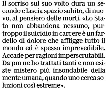 Nell’annunciare, proporre e quant’altro un “piano -ha titolato Il Giornale- per svuotare le carceri”, creandone di nuove nelle caserme dismesse, differenziando le detenzioni secondo i reati commessi o contestati o le condizioni degli inteessati, e ricorrendo sempre di più a “forme alternative” alla custodia in gabbia, il guardasigilli ha detto che “purtroppo il suicidio in carcere è un fardello di dolore che affligge tutto il mondo ed è spesso imprevedibile. Accade per ragioni imprescrutabili. Da pubblico ministero -ha voluto ricordare- ne ho trattati tanti e non esiste mistero più insondabile della mente umana quando uno cerca soluzioni così estreme”.
