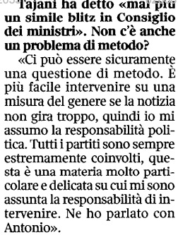All’altro vice presidente del Consiglio e segretario ora di Forza Italia la Meloni non ha mandato a dire ma ha detto direttamente di non fare concorrenza a Giorgetti. “Non c’è anche un problema di metodo”?, hanno chiesto gli intervistatori ricordando il “mai più un simile blitz in Consiglio dei Ministri” pronunciato appunto da Tajani. E lei, per niente “la bella addormentata nel bosco” appena datale da Matteo Renzi, ha risposto: “Ci può essere sicuramente una questione di metodo. E’ più facile intervenire su una misura del genere se la notizia non gira troppo…. Tutti i partiti sono sempre estremamente coinvolti. Questa è una materia molto particolare e delicata su cui mi sono assunta la responsabilità di intervenire”. E ha concluso, come per avvertire che il caso non esiste più: “Ne ho parlato con Antonio”.