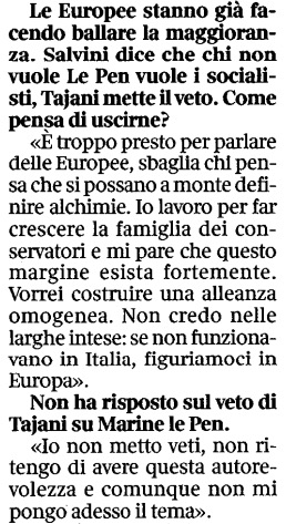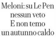 Anche il rifiuto della Meloni, nella masseria pugliese dove trascorre le vacanze, di porre veti contro la destra francese di Marine Le Pen in eventuali nuovi equilibri politici in Europa, come ha titolato Repubblica, va letto più contro Tajani che a favore di Salvini. La risposta contro il veto alla destra francese è stata data dalla Meloni ad una domanda sul no apposto alla Le Pen da Tajani, appunto.