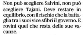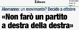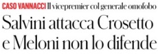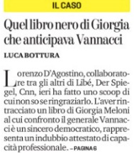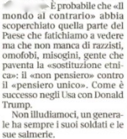 Ciascuno ormai dà il suo contributo quotidiano a far cadere il generale- che in qualche modo ha già dismesso la divisa e comincia a farsi intervistare dalle televisioni in maniche di camicia civile- nella tentazione di qualche candidatura politica. Il leader leghista Matteo Salvini lo ha già chiamato al telefono, cominciando col promettergli che avrebbe letto tutte le 300 pagine e più del suo libero. E lui, il generale, in una intervista al Tg1 ha rivendicato per sé il diritto e l’interesse a non escludere nulla, per cui Il Giornale non ha forzato la mano titolando: “Vannacci: politica, chissà…”.