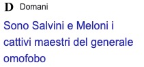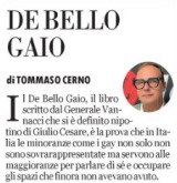 “La manina di Mattarella nella guerra al generale”, ha titolato su tutta la prima pagina La Verità– quella di Maurizio Belpietro- come per dare una chiave di lettura al più alto livello istituzionale di questo giallo d’estate che è ormai diventato il libro dell’ex comandante della Folgore Roberto Vannacci felicemente intitolato ai fini promozionali “Il mondo al contrario”. E naturalmente portato in testa alla classifica delle vendite dai suoi stessi detrattori con un’autorete sulla quale forse dovrebbero riflettere prendendo lezione da un omosessuale dichiarato come Tommaso Cerno. Che ha portato la vicenda sulla prima pagina della sua Identità più per scherzarci sopra che per indignarsi. “Il De Bello Gaio, il libro scritto dal Generale Vannucci che si è definito nipotino di Giulio Cesare- ha scritto il simpatico ex parlamentare pd ed ex direttore dell’Espresso– è la prova che in Italia le minoranze come i gay non solo non sono rappresentate ma servono alle maggioranze per parlare di sé e occupare gli spazi che finora non avevano avuto”.