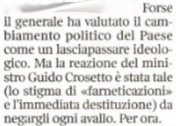 Belpietro ha cercato di attribuire la sua intuizione, sospetto e quant’altro sulla “manina” di Mattarella, disturbandone le vacanze sulle Dolomiti, al ministro della Difesa in persona, Guido Crosetto. Che ha raccontato di avere disposto la sostanziale rimozione di Vannacci dal comando dell’Istituto Geografico Militare di Firenze per soddisfare le attese, richieste, pressioni delle alte gerarchie militari, potendo bastare secondo lui un intervento meno drastico. Fra le altre gerarchie militari, con un po’ di buona volontà più che verità, al minuscolo, si potrebbe anche mettere Mattarella per il ruolo attribuitogli come presidente della Repubblica dall’articolo 87 della Costituzione di capo delle Forze Armate. Cui forse non ha esagerato ad attribuire “lo sconcerto” neppure Domani, il giornale dell’ingegnere Carlo De Benedetti in questa fase dichiaratamente “radicale” del suo impegno pubblico.