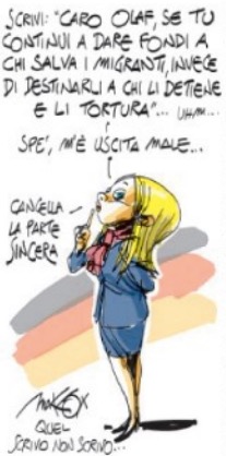 Con questo incidente di politica interna, chiamiamolo così, finendo per accreditare una manovra più di carta -ripeto- che altro, la Meloni ha ridotto la visibilità del successo conseguito nella sua missione a Malta confermando un rapporto privilegiato con la presidente della Commissione europea Ursula von der Leyen e col presidente francese Emmanuel Macron, e dando uno “schiaffo a Berlino” -altro titolo di Repubblica– con quell’accusa al cancelliere Olaf Sholz di volere fare “coi confini degli altri” solidarietà ai migranti selezionati dagli scafisti.