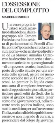 Pur cresciuta mangiando politica e cicoria, come direbbe Francesco Rutelli replicando una vecchia battuta autobiografica, la premier Giorgia Meloni è curiosamente inciampata a Malta, dove si trovava per un vertice europeo, nella trappola di un giornalista che l’ha interrogata sul tema tutto di carta di un governo tecnico. Tema sollevato sui giornali italiani: particolarmente quelli degli “Agnelli -ha titolato Il Giornale– che soffiano sullo spread”, senza peraltro riuscire a sollevarlo più di tanto. Esso infatti rimane ben sotto le punte che portarono nel 2011 l’ultimo governo di Silvio Berlusconi alla crisi e Mario Monti a Palazzo Chigi. Lo ha ricordato a suo modo Stefano Rolli nella sua vignetta sul Secolo XIX facendo dire alla Meloni che “lo spread non ci preoccupa” e ad un ascoltatore davanti alla televisione: “E’ proprio il Berlusconi day”, celebrato ieri a Paestum nell’ottantasettesimo anniversario della nascita dell’estinto.