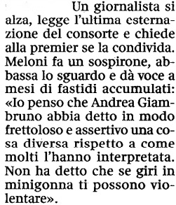 No. Della Meloni ingiustamente fascistizzata -ahimè- dal mio amico Piero Sansonetti, mi ha interessato di più la lezione che le è stato improvvidamente permesso di dare ai giornalisti in tema di libertà di stampa proponendole praticamente di dissociarsi dal convivente e padre di sua figlia che nell’esercizio della sua professione di conduttore televisivo ha esortato le ragazze a non ubriacarsi, drogarsi e simili nelle feste per evitare “il lupo” di turno. Pur attribuendo, a mio avviso esageratamente, al suo Andrea Giambruno un “modo frettoloso e assertivo”, la premier ha riconosciuto nelle sue parole quelle che la mamma le diceva a suo tempo: “occhi aperti e testa sulle spalle”. Che non significavano -ha spiegato per certi versi la figlia ormai cresciuta sino a guidare un governo- “se giri in minigonna ti possono violentare”. E non devi protestare o denunciare -aggiungo io- perché in fondo te la sei cercata.