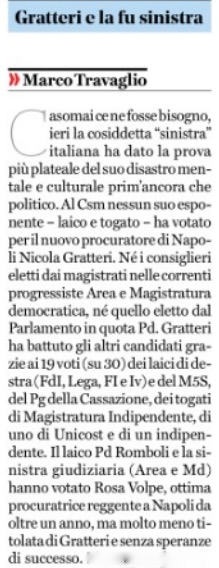L’imbarazzo -dicevo- è stato quello dei giornali sorpresi o infastiditi dal colore assunto dalla maggioranza che ha promosso Gratteri: decisamente di centrodestra, declassata sul Dubbio da Tiziana Majolo come prodotta da “correnti e palazzi”. Quella che invece Gratteri avrebbe meritato secondo il suo personale estimatore Travaglio -sì, sempre lui, il direttore del Fatto Quotidiano- sarebbe stata di sinistra, esclusiva e maggioritaria. “La fu sinistra”, ha commentato e titolato col suo editoriale l’ammiratore del procuratore, soddisfatto solo di non essere stato tradito dai grillini, unitisi alla destra nella votazione.
