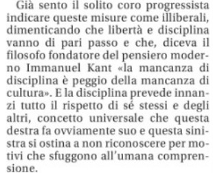 Non mi sono trattenuto da queste ironiche ma insieme amare riflessioni sulla stretta stradale neppure dopo avere letto l’entusiastico commento di Alessandro Sallusti tornato alla direzione del Giornale ed entusiasta del ritorno, a sua volta, della “disciplina” nei rapporti sociali, almeno sulla carta intestata del Consiglio dei Ministri e dintorni. Ho accettato il rischio, per quanto modesto, di finire associato al “solito coro progressista” abituato a “indicare queste misure come illiberali, dimenticando -ha scritto Sallusti- che libertà e disciplina vanno di pari passo e che, diceva il filoso fondatore del pensiero moderno Immanuel Kant, “la mancanza di disciplina è peggio della mancanza di cultura”. Che spreco di citazioni. Personalmente preferisco quell’” adelante Pedro cum juicio” di Antonio Ferrer, il grancancelliere a Milano durante la peste raccontata da Alessandro Manzoni nei “Promessi sposi”.
