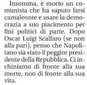 Fa il paio, purtroppo, con la “cattiveria” del Fatto Quotidiano il pesante giudizio espresso dal Giornale che fu di Indro Montanelli nell’editoriale dell’appena tornato direttore Alessandro Sallusti. Che ancora attribuisce la caduta dell’ultimo governo di Silvio Berlusconi, e in qualche modo anche la sua successiva condanna per frode fiscale e decadenza da senatore, non a sfortunate congiunture internazionali e, certamente, alla durezza della lotta politica condotta dagli avversari ma personalmente anche, o soprattutto, alla partigianeria di Napolitano. Che pure aveva impedito nel 2010 la caduta di Berlusconi per mano dell’allora presidente della Camera e leader della destra Gianfranco Fini. “E’ morto un comunista -ha scritto Sallusti- che ha saputo farsi camaleonte e usare la democrazia a suo piacimento per fini politici di parte. Dopo Oscar Luigi Scalfaro (se non alla pari), penso che Napolitano sia stato il peggior presidente della Repubblica. Ci inchiniamo di fronte alla sua morte, non di fronte alla sua vita”.
