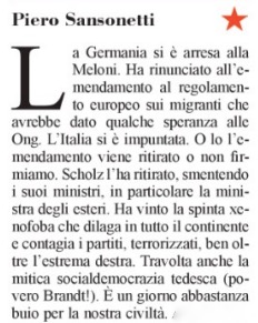 Ma, ahimè, anche il manifesto ancora dichiaratamente e orgogliosamente comunista ha trasformato il prudente “stralcio” della proposta tedesca al vertice di Granata annunciato dal Corriere della Sera in una “marcia indietro di Berlino”. Non parliamo poi del soccorso involontariamente prestato a Sechi, e alla premier, da Piero Sansonetti in persona sull’Unità.