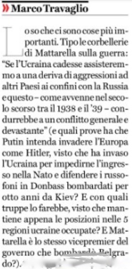 “Con quali truppe” -ha chiesto Travaglio- Putin potrebbe fare quello che teme Mattarella, “visto che mantiene appena le posizioni nelle 5 regioni ucraine occupate?”. Eppure lo stesso Travaglio scrive ogni volta che gli capita del carattere velleitario, a dir poco, della resistenza degli ucraini, e degli occidentali che lo aiutano, alla soverchiante superiorità delle truppe russe. Alle quali sarebbe stato persino più umano arrendersi subito, piuttosto che subire tante perdite fisiche e materiali. Ah, la coerenza!