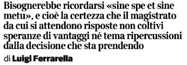 Il buon Luigi Ferrarella ci invita proprio oggi sul Corriere della Sera a pensare alla domanda che un magistrato è costretto o solo portato a porsi ogni volta che deve prendere una decisione, visto il clima polemico che si è creato nei tribunali e dintorni. Sarebbe la domanda sui vantaggi o rischi che corre ogni volta che deve, appunto, decidere. Vantaggi e rischi, evidentemente, ai fini della sua popolarità – o impopolarità, visto che i sondaggi, come ha appena verificato Alessandro Ghisleri sulla Stampa. non sono incoraggianti per le toghe- e della sua carriera.