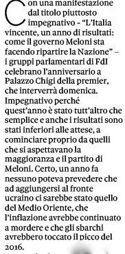 Il deputato Giovanni Donzelli, un fratello d’Italia coetaneo della Meloni, già noto per una certa quale ribalderia mediatica e parlamentare, dal teatro romano dove è stata metaforicamente spenta la prima candelina del governo ha annunciato “nessun riguardo per Mediaset”. Che invece di riguardi ha bisogno dal governo di turno per quella cosa complicata che si chiama “conflitto d’interessi”. E di cui la buonanima del fondatore Silvio Berlusconi non volle liberarsi neppure quando Rupert Murdoch gli fece proposte di acquisto del Biscione a prezzi stratosferici, come ancora gli rimprovera alla memoria l’ex alleato Pier Ferdinando Casini, ora senatore quasi di diritto o a vita del Pd.
