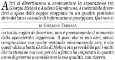 Sotto questo profilo non solo la Meloni, affacciatasi in video ieri al Brancaccio, ma tutto il clan dei suoi familiari e intimi dovrebbe ringraziare Ricci, che probabilmente aspetta al telefono, e tutta intera quell’azienda complessa e singolare che è Mediaset. Dove può accadere che un dipendente, nominato sul campo “imperatore dei rompicoglioni” da un Fedele Confalonieri tanto fuori dalla grazia di Dio da parlare solo in dialetto milanese stretto per dirgli tutto il resto, conti più dei proprietari, amministratori, dirigenti e via dicendo. E possa mettere nel suo frigorifero bustine di fuorionda imbarazzanti da prelevare e adoperare quando gli pare e piace, fregandosene altamente di tutti i guai, e simili, che può provocare.