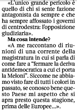 Li chiamerei, entrambi, richiamini di fronte all’”alta tensione” nei rapporti fra governo e magistratura annunciata in apertura dal Corriere della Sera, all’”assalto” delle toghe preferito dal Giornale o al “governo in trincea” di Domani, il giornale della “radicalità” scoperta e praticata in vecchiaia avanzata da Carlo De Benedetti.