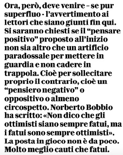 Persino il direttore di Repubblica ha ritenuto di avvertire i lettori, in una postilla anonima, che il suo autorevole collaboratore non deve essere frainteso. E ha scomodato il compianto Norberto Bobbio per ricordare che “gli ottimisti non sono sempre fatui ma i fatui sono sempre ottimisti”. Meglio quindi polemizzare pesantemente, con insulti e simili.