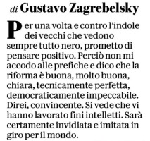 Zagrebelsky, che ripone la sua fiducia intimimamente oppositoria nella capacità dei partiti minori dell’attuale maggioranza di accorgersi che finirebbero di esistere nel sistema proposto dal disegno di legge governativo, ha scritto della riforma su Repubblica come neppure è riuscito a parlarne, in un’ìntervista soddisfatta al Corriere della Sera, il presidente del Senato Ignazio La Russa.