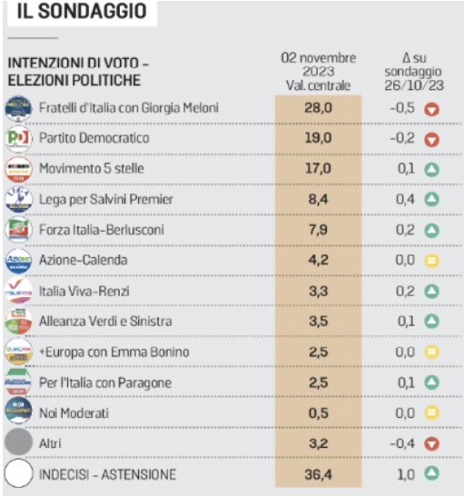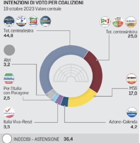 In compenso la Lega di Matteo Salvini risultava all’8 per cento, con un aumento di quasi mezzo punto: esattamente lo 0,4. Forza Italia di Antonio Tajani era al 7.9, con un aumento dello 0,2 per cento. Un altro mezzo punto era assegnato ai moderati di Maurizio Lupi. Il totale del centrodestra era quindi del 44,8 per cento, pari al dato per coalizioni rilevato da analogo sondaggio del 19 ottobre. La percentuale raccolta l’anno scorso nelle urne dall’attuale maggioranza era stata del 43,79 per cento.