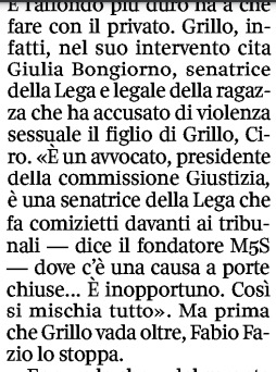 Alla Stampa e altri giornali sono stati invece colpiti maggiormente dal sostanziale conflitto d’interessi in cui Grillo è caduto col “vergognoso” attacco -ha titolato il quotidiano torinese- alla senatrice leghista Giulia Bongiorno, presidente della Commissione Giustizia di Palazzo Madama. Che è anche l’avvocato che con i suoi “comizietti” in tribunale si sta battendo più del pubblico ministero contro il figlio del comico, Ciro, accusato di stupro. E difeso invece dal padre prima e più ancora dell’avvocato assunto per farlo nelle sedi proprie.