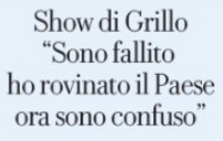 Alla Repubblica e Libero – così diversi, anzi opposti per linea politica, una decisamente contro e l’altro decisamente favorevole al governo della Meloni, che Grillo crede destinato a cadere “da solo”, senza che le opposizioni si scomodino in Parlamento e nelle piazze- è piaciuta soprattutto la confessione semiseria, o semicomica, di avere “fallito e rovinato il Paese”. Davanti alle cui rovine lui è il primo ad essere “confuso”. Forse esagerando nel prenderlo sul serio Libero si è spinto al titolo hemingueiano di “Addio alle armi”.