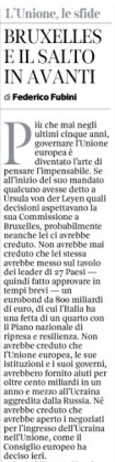 Il povero Federico Fubini rischia di finire in un manicomio riaperto apposta per lui avendo scritto tutt’altro nell’editoriale del Corriere della Sera sul “salto in avanti” a Bruxelles. Dove “governare l’Unione europea è diventato l’arte di pensare l’impensaibile”. “Se all’ìinizio del suo mandato qualcuno avesse detto a Ursula von der Leyen- ha scritto Fubini- quali decisioni aspettavano la sua Commissione, probabilmente neanche lei ci avrebbe creduto. Non avrebbe mai creduto che lei stessa avrebbe messo sul tavolo dei leader di 27 Paesi -quasi tutti in tempi brevi- un eurobond da 800 miliardi, di cui l’Italia ha una fetta di un quarto con il piano nazionale di ripresa e resilienza”. Una fetta che non abbiamo perduto né con l’arrivo della Meloni a Palazzo Chigi né dopo più di un anno di governo, durante il quale la premier si è messa peraltro a fare concorrenza al suo predecessore Mario Draghi, pur imprudentemente criticato qualche giorno fa, nell’accumulare foto di incontri internazionali per il suo album.