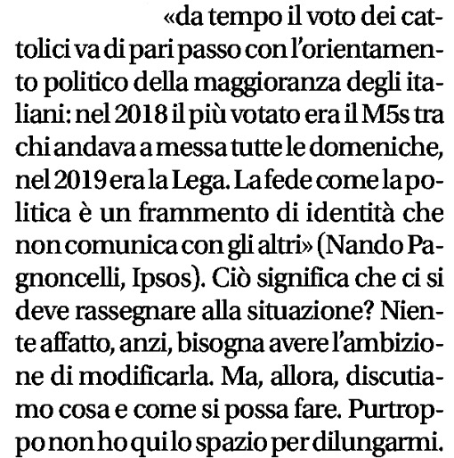 Lo stesso Castagnetti ha citato le indagini Ipsos di Nando Pagnoncelli per ricordare che “da tempo il voto dei cattolici va di pari passo con l’orientamento politico della maggioranza degli italiani: nel 2018 il più votato era il Movimento 5 Stelle tra chi andava a messa tutte le domeniche, nel 2019 era la Lega”. Che salì quell’anno al 34 per cento dei voti nelle elezioni europee, dopo avere già sorpassato nel centrodestra l’anno prima la Forza Italia di Silvio Berlusconi. Ora è la volta del partito della Meloni che ogni tanto grida in piazza, non a caso, di essere “donna, madre, cristiana…”. Ed ha stretto ormai un’amicizia solidissima con la popolare tedesca Ursula von der Leyen, presidente uscente e forse anche rientrante della Commissione Europea.