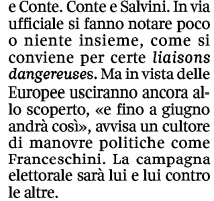 “Conte e Salvini -ha raccontato il retroscenista principe del Coriere, Francesco Verderami- in via ufficiale si fanno notare poco o niente insieme, come si conviene per certe liaisons dangereuses. Ma in via delle elezioni europee usciranno ancora allo scoperto”, cioè al semiscoperto, “e fino a giungo andrà così, avvisa un cultore di manovra politiche come Franceschini. La campagna elettorale elettorale sarà lui e lui contro le altre”. Cioè i fantasmi contro le persone reali. Più che una campagna elettorale, una seduta spiritica. La Meloni si può pure ricompore e distogliere gli occhi dal lucernaio della Camera.