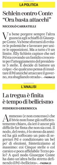 Ha impiegato un po’ di tempo a capire l’aria che tira ormai nel Pd contro di lei, tra i borbottii fra i corridoi della Camera, del Senato e del Nazareno e le tiratine d’orecchie pur metaforiche di Romano Prodi nelle interviste, ma alla fine Elly Schlein ha deciso di mandare qualche segnale reattivo. Qualche segnale cioè di stanchezza, di fastidio, di insofferenza sulla strada del sorpasso tentato dal suo concorrente o avversario, più che potenziale alleato Giuseppe Conte.