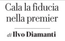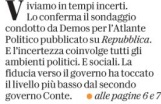 Notoriamente schierata contro Giorgia Meloni e il suo governo, da cui si sente minacciata più di quanto la premier si senta perseguitata dai suoi attacchi continui, la Repubblica di carta avrebbe dovuto aprire oggi con la notizia che ha invece sistemato a metà della prima pagina, non molto visibile, presa da un sondaggio appena effettuato da Demos e riferito da Ilvio Diamanti. “Cala la fiducia nella premier”, annuncia il quotidiano che ricorda ancora sotto la testata il suo fondatore Eugenio Scalfari, come l’Unità Antonio Gramsci.