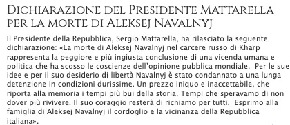 Il merito di questo risveglio in extremis, di questo recupero del senso della dignità anche dell’informazione, e non solo della politica, va riconosciuto al presidente della Repubblica Sergio Mattarella. Che conoscendo -temo- i suoi polli aveva voluto essere all’arrivo della notizia dalla Russia il più tempestivo e duro nella denuncia della “peggiore e più ingiusta conclusione di una vicenda umana e politica che ha scosso le coscienze dell’opinione pubblica mondiale”. “Per le sue idee e per il suo desiderio di libertà Navalnyi -aveva ricordato Mattarella- è stato condannato a una lunga detenzone in condizioni durissime, Un prezzo iniquo e inaccettabile, che riporta alla memoria i tempi più bui della storia. Tempi che speravamo di non dover più rivivere. Il suo coraggio resterà di richiamo per tutti. Esprimo alla famiglia il cordoglio e la vicinanza della Repubblica italiana”. Grazie, Presidente.