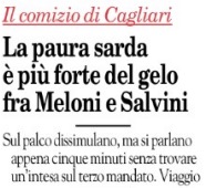 Il Foglio non ha forse sbagliato titolando non tanto sul comizio di Cagliari, quanto sulla foto del palco contenente i leader nazionali del centrodestra accorsi a sostenere il candidato a “governatore” nelle elezioni regionali di domenica, che “la paura sarda è più forte del gelo fra Meloni e Salvini”. Fisicamente accanto, in effetti, ma sottopelle distanti.