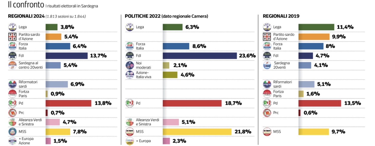 Fra le varie foto celebrative delle elezioni che hanno portato alla presidenza della regione sarda Alessandra Todde, la prima come donna nell’sola e come grillina in tutta Italia, un ingenuo o sprovveduto, ma non tanto da non riconoscere le persone riprese in aria compiaciuta e festiva, si sarà soffermata su quella che ritrae insieme, da sinistra a destra, solo i pentastellati Ettore Licheri, Giuseppe Conte e Todde. E si sarò chiesto quanti voti sia riuscito a raccogliere nelle urne il loro movimento per essere salito così in alto, al vertice della regione, Ma scopre, consultando le mappe dei partiti, con i loro simboli, che quello delle cinque stelle è l’unico che condivide con la Lega di Matteo Salvini, nello schieramento opposto di centrodestra, o di destra-centro, la disavventura di un arretramento generale, rispetto sia alle precedenti elezioni regionali, del 2019, sia alle ultime elezioni politiche, del 2022.