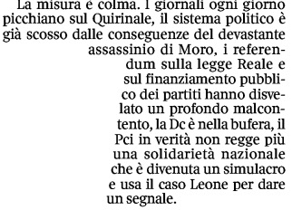 Veltroni la mette invece così in un passaggio dell’articolo, scritto dopo avere consultato anche le carte di Leone depositate in Parlamento: “I giornali ogni giorno picchiano sul Quirinale, il sistema politico è già scosso dalle conseguenze del devastante assassinio di Moro. I referendum sulla legge Reale e sul finanziamento pubblico dei partiti hanno disvelato un profondo malcontento, la Dc è nella bufera, il Pci in verità non regge più una solidarietà nazionale che è divenuta un simulacro e usa il caso Leone per dare un segnale”. Un segnale.