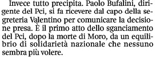 “Paolo Bufalini -racconta ancora Veltroni, che a 23 anni già frequentava come un mezzo dirigente la sede del Pci alle Botteghe Oscure- si fa ricevere dal capo della segreteria Valentino per comunicare la decisione presa. E’ il primo atto dello sganciamento del Pci, dopo la morte d Moro, da una un equilibrio di solidarietà nazionale che nessuno sembra più volere”. La decisione, naturalmente, è quella di farlo dimettere, di deporlo sei mesi prima della scadenza del mandato.