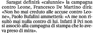 Lo stesso Bufalini -racconta più avanti Veltroni – “ammetterà: A me non risultò mai nulla contro di lui. Infatti il Pci non si associò alla campagna di stampa che lo aveva preso di mira”. Esso fece di più: impose alla Dc e ai suoi uomini, a cominciare dal presidente del Consiglio Giulio Andreotti e dal segretario del partito Benigno Zaccagnini, le dimissioni di Leone, in uno scenario più da Cremlino, di allora e di oggi, che da Quirinale. Una vergogna rimasta semplicemente impunita.