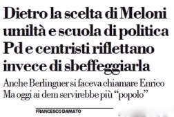 Non a caso, del resto, mentre il Pd arranca nei sondaggi, e in alcune elezioni locali, attorno al 20 per cento come se fosse un affare, peraltro insidiato da quel che è rimasto delle 5 Stelle di Beppe Grillo e ora di Giuseppe Conte, i fratelli e le sorelle d’Italia viaggiano attorno alle dimensioni che furono della Democrazia Cristiana. Sveglia, ragazzi. Per ripetere qualcosa già gridato dalla Meloni nell’aula di Montecitorio contro i banchi piddini.