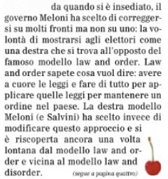 Ma io voglio anche offrirvene testualmente la parte conclusiva, comprensiva della ciliegia con la quale Cerasa si firma come il fondatore Giuliano Ferrara con l’elefantino rosso: “Da quando si è insediato, il governo Meloni ha scelto di correggersi su molti fronti ma non su uno: la volontà di mostrarsi agli elettori come una destra che si trova all’opposto del famoso modello law and order. Law and order sapete cosa vuol dire: avere a cuore le leggi e fare di tutto per applicare quelle leggi per mantenere un ordine nel paese. La destra modello Meloni (e Salvini) ha scelto invece d modificare questo approccio e si è riscoperta ancora una volta lontana dal modello law and order e vicina al modello law and disorder”.