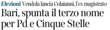 Pochi centimetri più sopra sulla prima pagina del Corriere della Sera -ripeto- c’è oggi questo titolo: “Elezioni- Vendola lancia Colaianni, l’ex magistrato – Bari, spunta il terzo nome per Pd e Cinque Stelle”. Colajanni si chiama Nicola, come il patrono di Bari.
